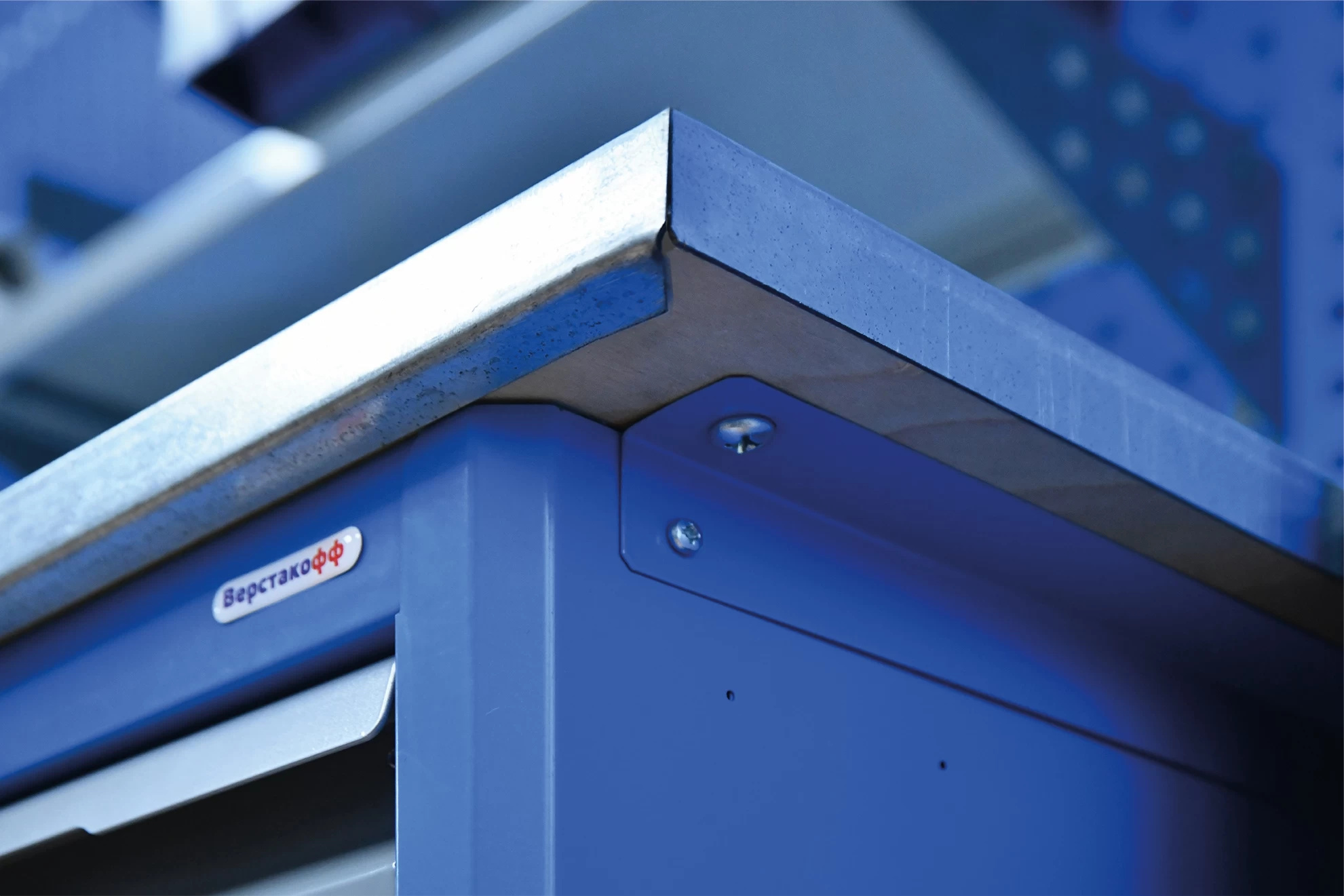 - Фанера ФСФ обработана лаком-антисептиком, а металлические детали окрашены порошковым полиэфирным составом – благодаря этому верстак устойчив к маслам, растворителям и моющим средствам.